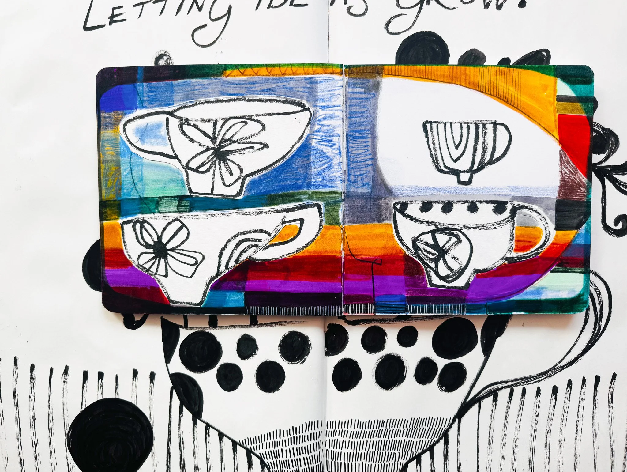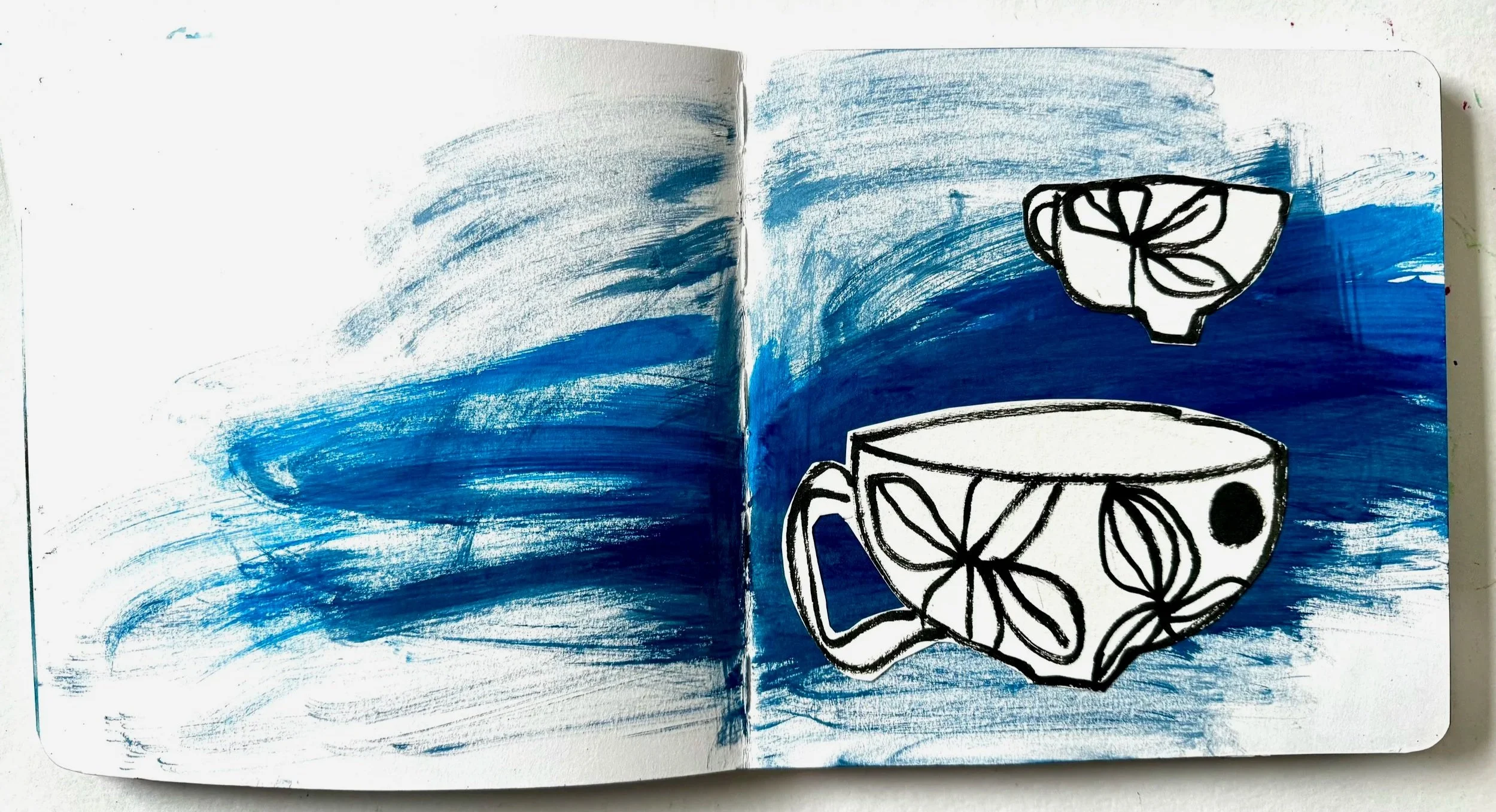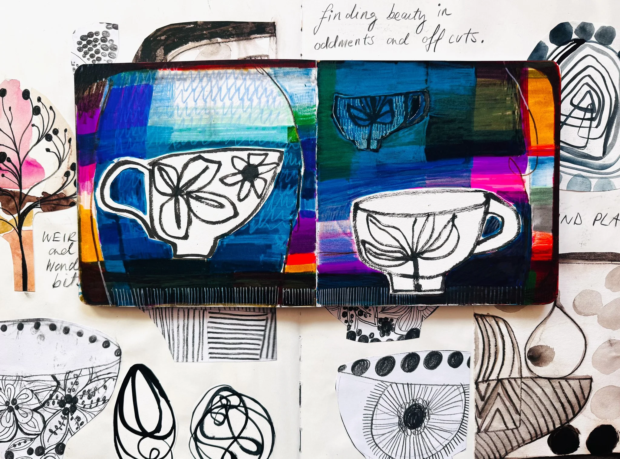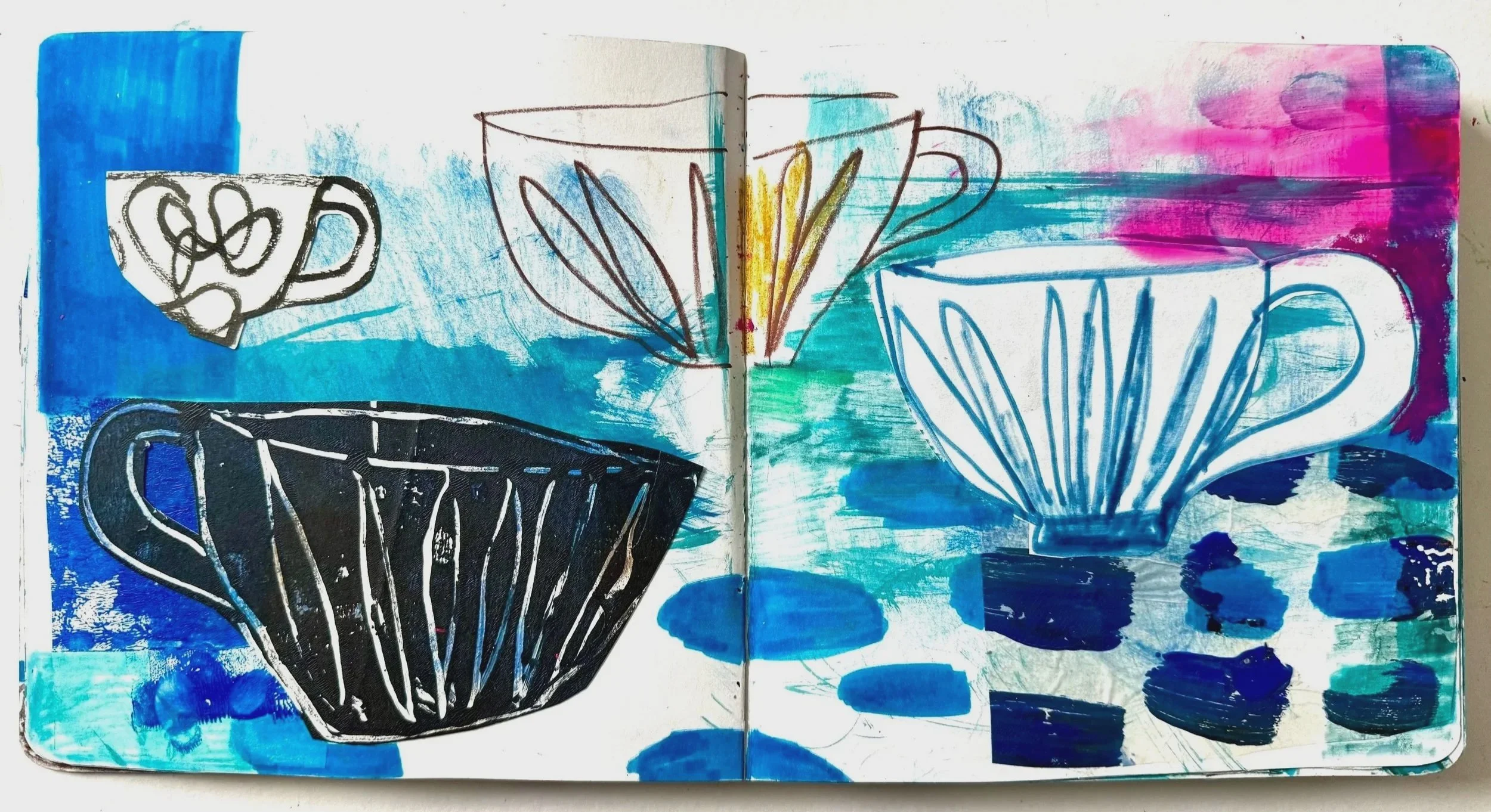 At the start of this year, I made a tiny promise to myself, to fill up the sketchbooks I already have, before buying any more. This one is half full of mixed-media cups. I made them, I loved them and then I put the sketchbook on a shelf and promptly forgot about it.